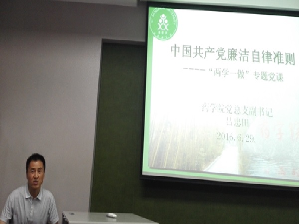 2016年6月29日下午,药学院党总支副书记吕忠田在E-307面向药学院教工二支部全体党员讲授《中国共产党廉洁自律准则》专题党课。 药学院党总支副书记吕忠田讲授《中国共产党廉洁自律准则》 围绕《中国共产党廉洁自律准则》,吕书记分别阐释了“四个必须”、“八条规范”的含义。他讲到,每个党员干部都必须遵守廉洁自律准则,始终保持廉洁自律的行为规范。号召党员同志要始终保持勤奋学习的习惯,不断加强学习才能提高自身素质和...