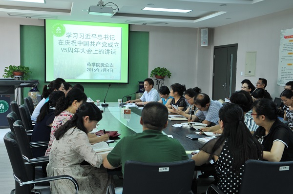 (药学院)2016年7月4日下午,药学院党总支在E-307召开全体教职工大会,学习习近平总书记在庆祝中国共产党成立95周年大会上的讲话,会议由药学院党总支副书记吕忠田主持。 药学院党总支副书记吕忠田讲话 会上,吕书记首先总结和回顾了药学院党总支近期开展“两学一做”学习教育活动工作,并对下一步“两学一做”学习教育进行安排,他要求各党支部和广大党员要把学习贯彻习近平总书记“七一”重要讲话精神作为首要政治任务切实抓...