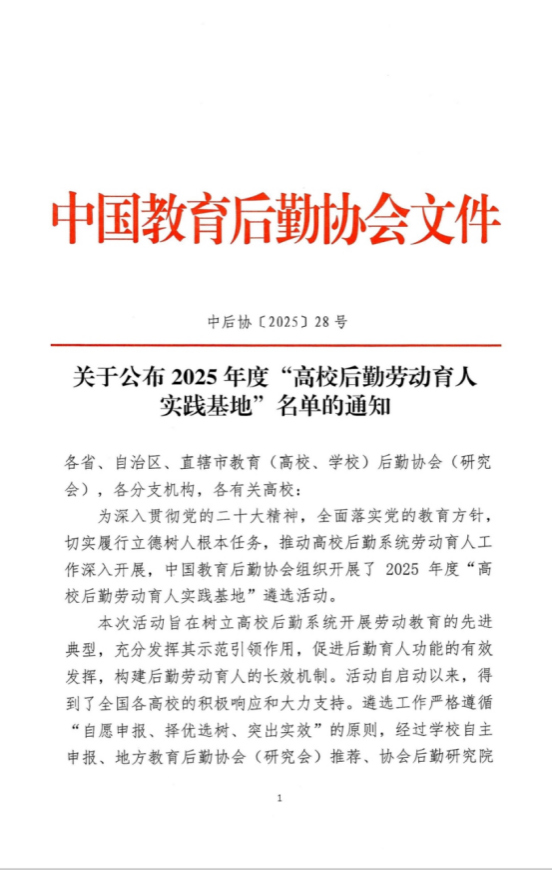 近日,中国教育后勤协会公布了2025年度“高校后勤劳动育人实践基地”名单,清华大学等全国80所高校入围。其中,我校与西安交通大学等5所陕西高校名列其中。此次入选实践基地,是在此前省教育后勤协会授予我校“服务育人劳动教育示范基地”的基础上,学校持续深化劳动教育的成果,标志着我校“十大育人”体系“服务育人”劳动教育板块跻身全国高校先进行列。一体推进劳动育人工作近年来,劳动教育广受关注和重视。2020年3月20日...