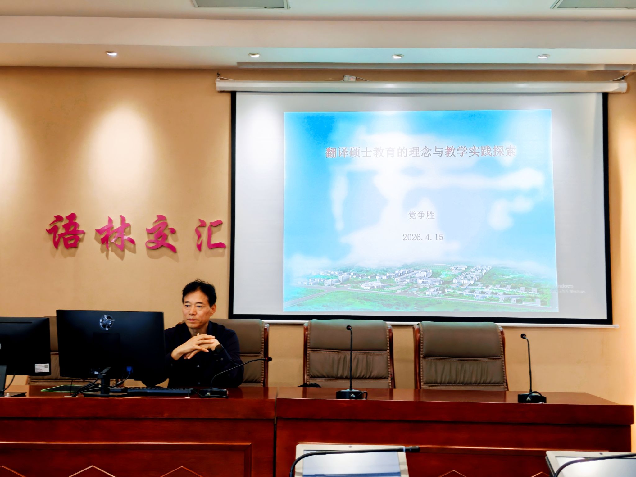 4月15日下午,全国翻译专业学位研究生教育指导委员会委员、西安外国语大学教授、博士生导师党争胜来校作题为“翻译硕士教育的理念与教学实践探索”的学术报告。学术报告由外国语学院院长薛英利主持,外国语学院全体专任教师和英语专业本科生参会研学。党争胜作报告党争胜首先引入“翻译”的再思考,阐释了翻译工作的时代价值,强调翻译是文明对话的桥梁、文化传播的核心媒介,呼吁广大翻译工作教育工作者和从业者坚定翻译自信,...