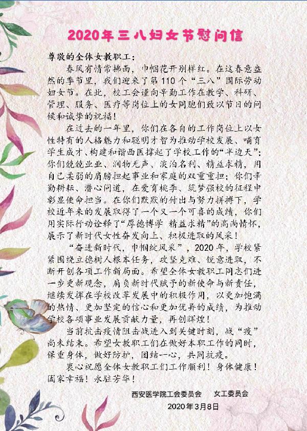 在全国各地生产生活秩序逐步恢复的重要时刻,我们迎来了第110个国际三八妇女节。西安医学院工会按照“强信心、暖人心、稳民心”的总体活动定位,早谋划、早部署,探索运用“互联网+工会”方式,通过开展“发出一封慰问信,统计表彰2019年‘巾帼建功立业’先进女职工,征集抗击疫情文艺作品、居家健身达人及厨艺展示微视频,立足岗位抗疫情—女职工在行动征文活动,发放女工福利慰问品”等系列活动,组织各分会女职工在疫情防控...