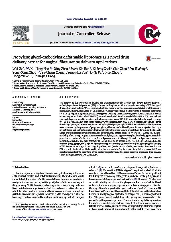 热烈祝贺我校药学院李伟泽博士及其团队在国际药学领域的著名杂志《Journal of Controlled Rlease》(IF=7.705)发表科研论文“Propylene glycol-emboding deformable liposomes as a novel drug delivery carrier for vaginal fibrauretine delivery applications” ,标志着我校在药剂学领域的研究取得高水平研究成果。
