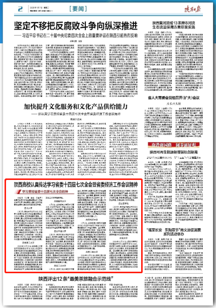1月7日,《陕西日报》第2版要闻刊发陕西高校认真传达学习省委十四届七次全会暨省委经济工作会议精神的新闻报道,我校相关工作开展情况被重点选登。近年来,学校坚持不懈用党的创新理论凝心铸魂,强化师生思想理论武装,从制度、学习方式、督查反馈机制等方面着手,构建行之有效、知行合一的政治理论学习范式。校院两级党组织深入学习贯彻习近平新时代中国特色社会主义思想,及时跟进学习 习近平总书记重要讲话、重要指示批示精...