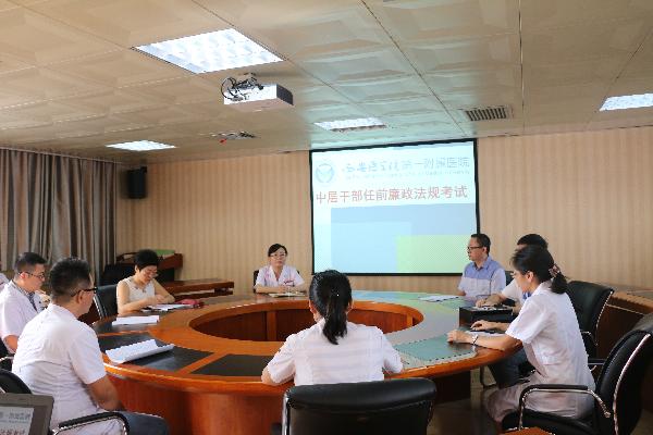 (第一附属医院)为进一步加强对中层干部的反腐倡廉教育,增强中层干部党纪国法观念,促进廉洁从医从政意识,8月12日上午,我校第一附属医院对7名拟提任的中层干部进行任前廉政法规考试。第一附属医院党委副书记、纪委书记杨西萍同志考前强调,此次考试一方面是考查中层干部对廉政法规知识的掌握情况,另一方面是推进医院党风廉政建设继续向前发展,参加考试人员应高度重视,认真仔细答题。 第一附属医院党委副书记、纪委书记...