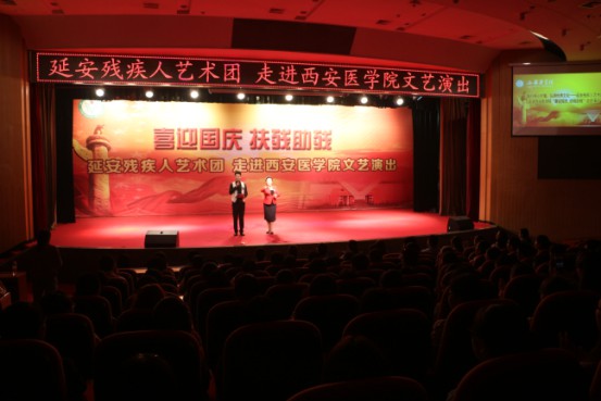 (团委)为深入培育和践行社会主义核心价值观,推进优秀文化进校园,由校团委主办的“喜迎国庆,扶残助残”——延安残疾人艺术团走进西安医学院文艺演出,于2016年9月26日晚7点在我校未央校区学术报告厅成功举行。 出席文艺演出的有西安医学院党委书记范兵,党委副书记熊冬梅,党委宣传部部长马征,党政办公室副主任张雨新,公共卫生系党总支副书记张光伟,团委书记王燕,以及校团委全体成员和各院系团总支书记、辅导员等。 演...