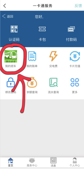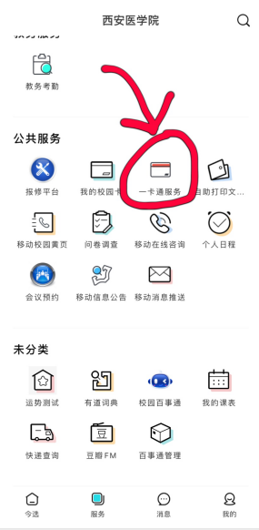 操作步骤:1.打开“今日校园”,找到并选择“一卡通服务”。