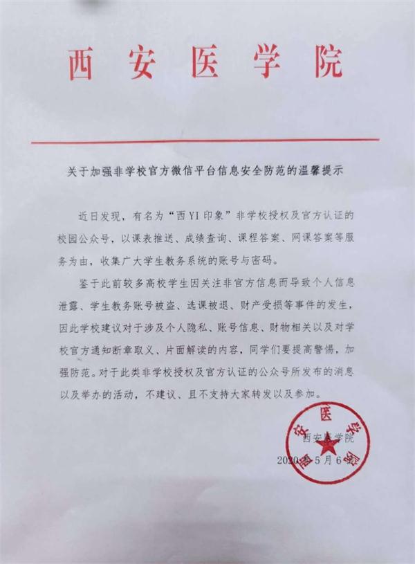 近日发现,有名为“西YI印象”非学校授权及官方认证的校园公众号,以课表推送、成绩查询、课程答案、网课答案等服务为由,收集广大学生教务系统的账号与密码。