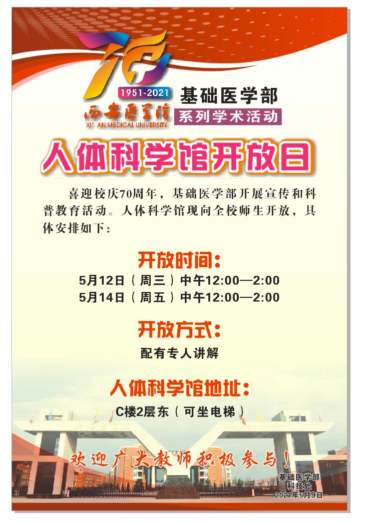 喜迎校庆70周年,基础医学部积极开展科普宣传教育活动。人体科学馆现向全校师生开放,具体安排如下: