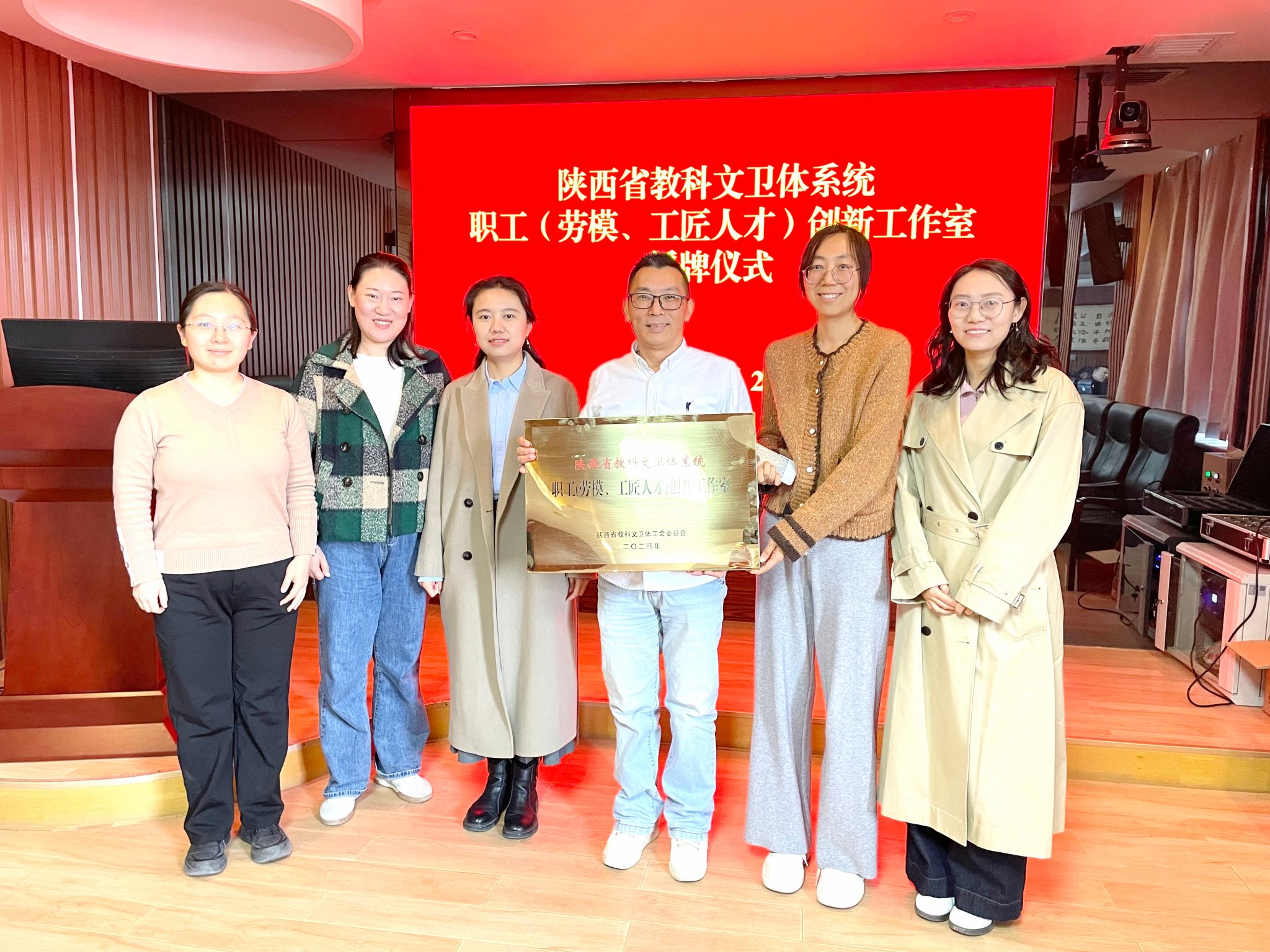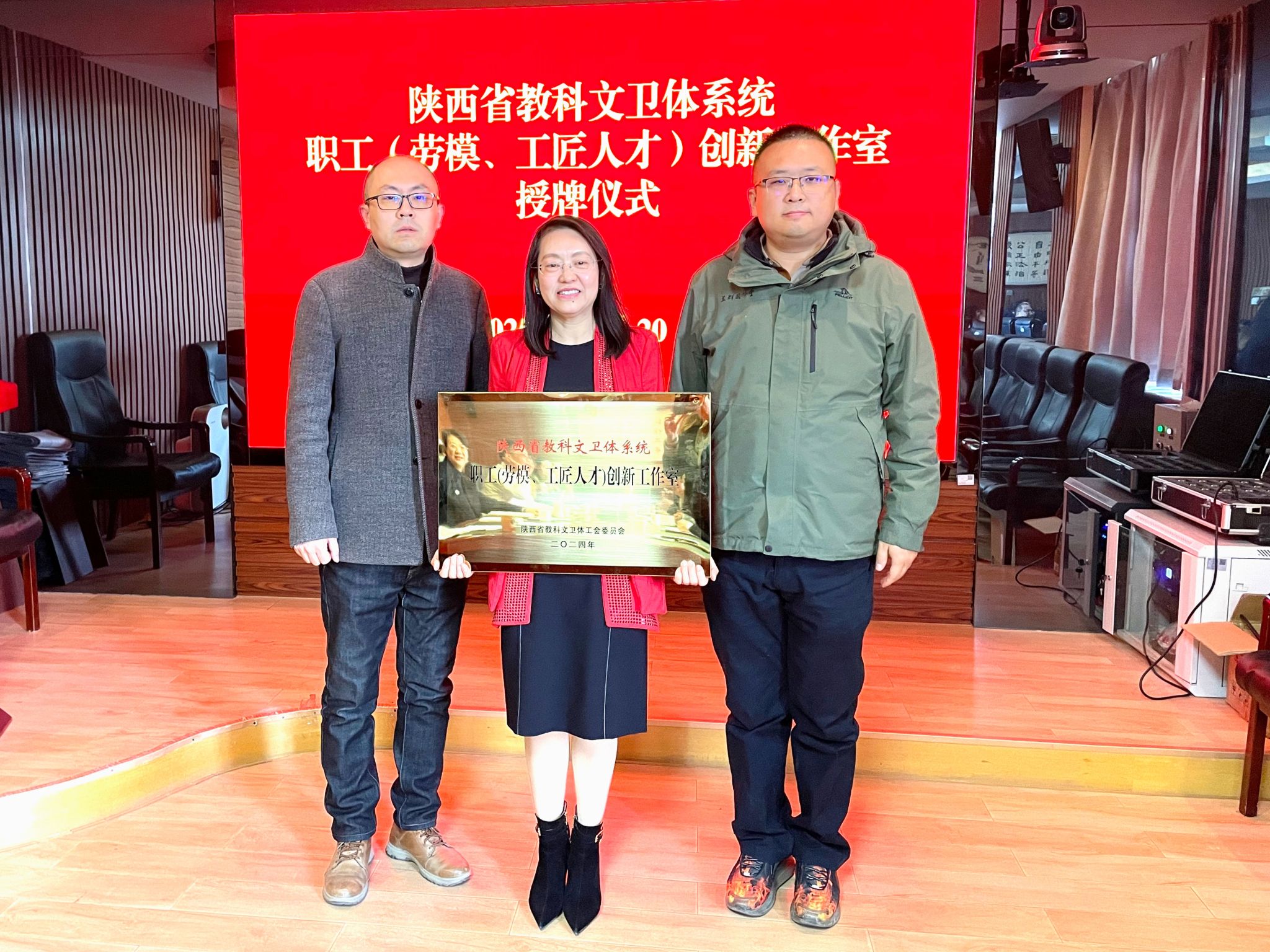 吕宝宣读了省教科文卫体工会《关于命名2024年陕西省教科文卫体系统职工(劳模、工匠人才)创新工作室和创新工作室联盟的决定》。杨卓虎分别为“曹慧玲理性药物设计与发现创新工作室”和“苟兴春心脑系统重大疾病防治研究创新工作室”授牌。