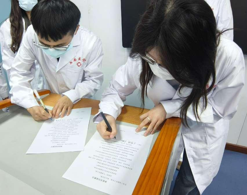 中午,基础医学部党总支开展了“无语良师铸医魂,清风正气守初心”主题党日活动暨局部解剖学实验课开课仪式。党总支书记尚瑜代表师生,向遗体捐献者朱玉祥老师及家属表示最崇高的致敬。师生代表分别作了发言,表示要秉承“厚德博学 精益求精”的校训,倍加珍惜“无语良师”提供的宝贵学习机会,心存感恩,以严谨的态度钻研医学知识,以仁爱之心践行医者使命。全体师生诵读《希波克拉底誓言》,向“无语良师”敬献鲜花、默哀致敬,感恩他们无私奉献的精神。同学们在誓言书上庄重地签上自己的名字,表达对遗体捐献者的崇高敬意和深切哀思。