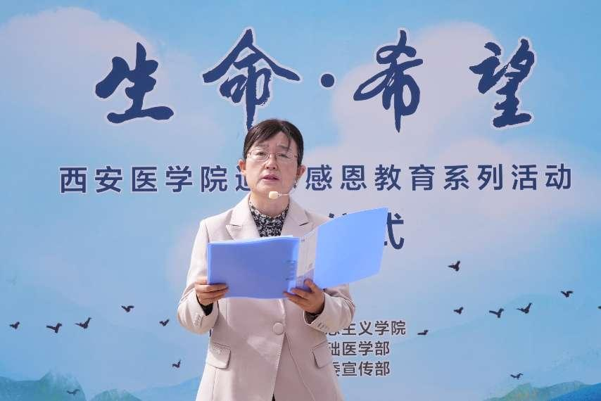 熊冬梅在致辞中指出,遗体捐献是镌刻在人类文明长河中的伟大壮举,是一座闪耀着人性光辉的不朽丰碑,每一位捐献者化作了医学生掌握精湛技艺的珍贵教具,成为科研攻坚路上开启未知大门的关键钥匙,他们的名字,深深烙印在西安医学院教育教学厚重史册之中,激励着无数西医学子,无畏艰难险阻,勇攀医学高峰。她强调,举办追思感恩教育活动,不仅是对奉献者们进行深切缅怀,更是希望能够进一步推动遗体捐献知识宣传普及,通过生动形象的案例、通俗易懂的科普,普及遗体捐献知识,点燃社会各界投身遗体捐献事业的热情之火。她希望全体师生积极行动起来,从自身做起,积极支持、踊跃参与遗体捐献宣传普及工作,为医学事业的发展添砖加瓦,为增进人类健康福祉奋力拼搏。