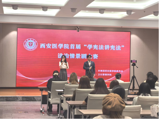 为深入学习贯彻习近平法治思想,坚定青年学生法治信仰和法治自觉,提高青年学生学法用法积极性,9月26日,学校举办首届“学宪法 讲宪法”法治情景剧大赛。活动由校团委主办、卫生管理学院承办。