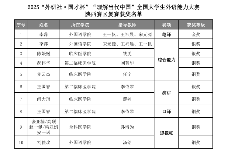 11月1日至2日,2025“外研社·国才杯”“理解当代中国”全国大学生外语能力大赛陕西赛区复赛在西安建筑科技大学举办。我校选派参赛的8名同学在综合能力、演讲、口译、笔译、短视频等多个赛项中表现优异,经过激烈角逐,最终斩获1枚金奖、3枚银奖和6枚铜奖,充分展现了西医学子扎实的外语语言功底与跨文化沟通能力。