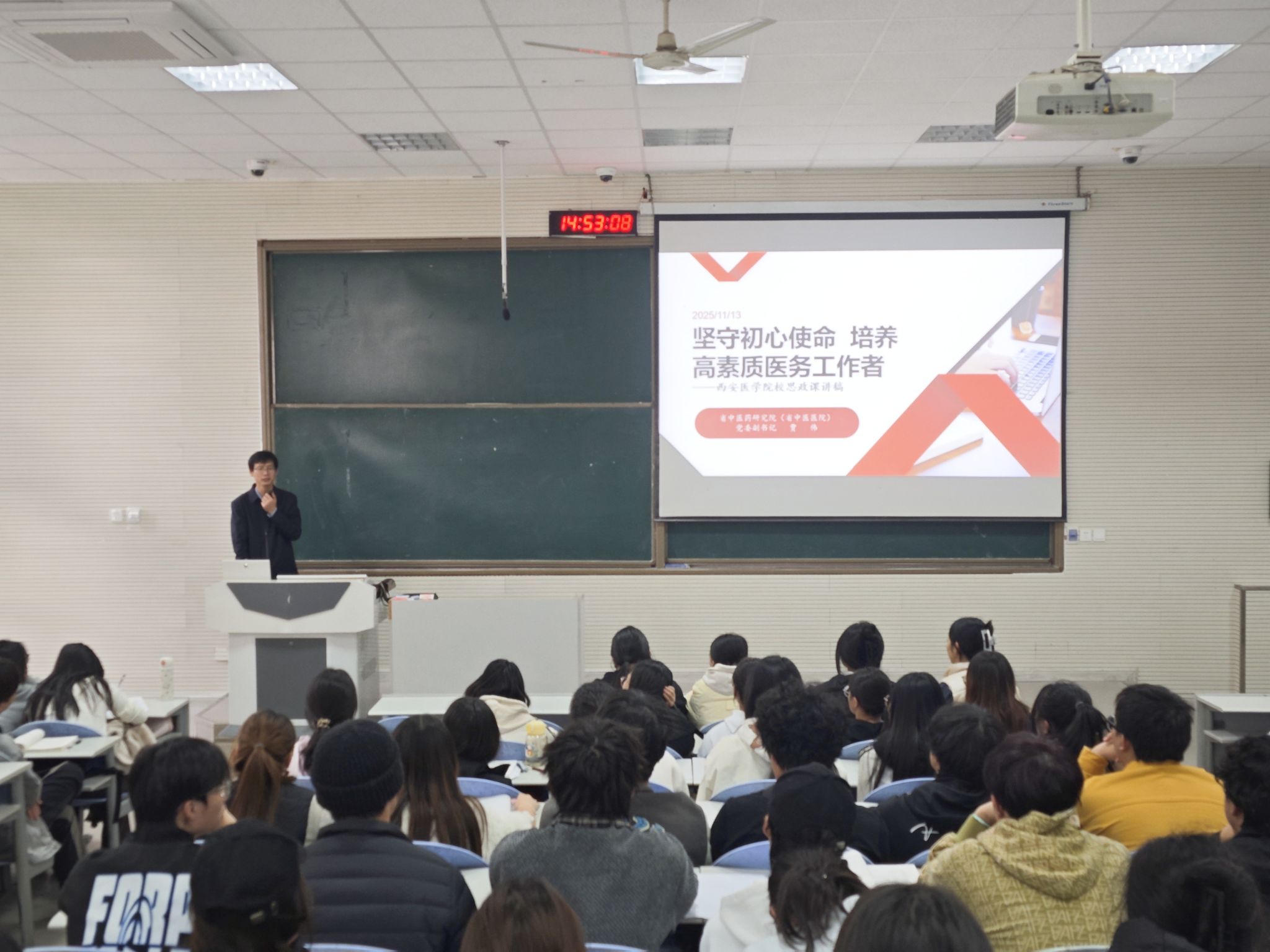 为深入贯彻落实习近平总书记关于学校思想政治理论课建设的重要指示精神,全面推进“大思政课”建设,推动落实立德树人根本任务,11月13日,学校邀请陕西省中医药研究院(陕西省中医医院)党委副书记贾伟来校为药学本科2470班、2471班学生讲授思政课。