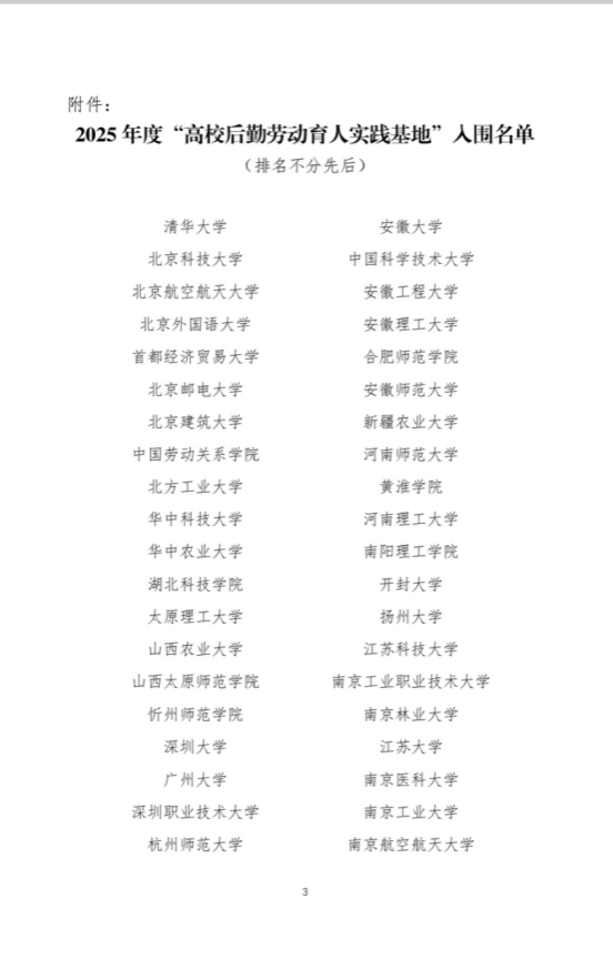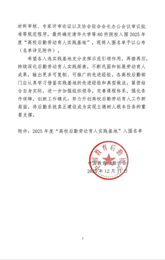 近日,中国教育后勤协会公布了2025年度“高校后勤劳动育人实践基地”名单,清华大学等全国80所高校入围。其中,我校与西安交通大学等5所陕西高校名列其中。此次入选实践基地,是在此前省教育后勤协会授予我校“服务育人劳动教育示范基地”的基础上,学校持续深化劳动教育的成果,标志着我校“十大育人”体系“服务育人”劳动教育板块跻身全国高校先进行列。
