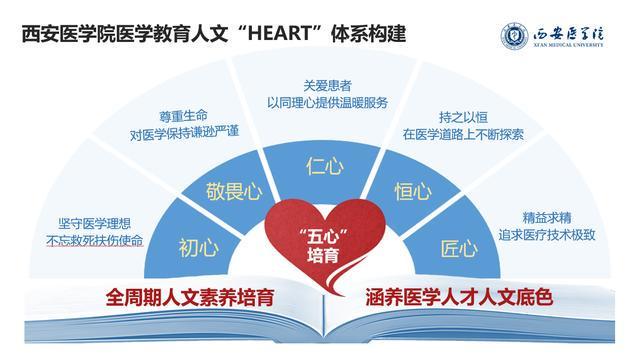 西安医学院以“培育之HEART”为核心,构建了覆盖医学生入学到毕业全周期的人文素养培育体系,将初心、敬畏心、仁心、恒心、匠心等“五心” 融入育人各环节,让人文精神成为未来医者的职业基因。