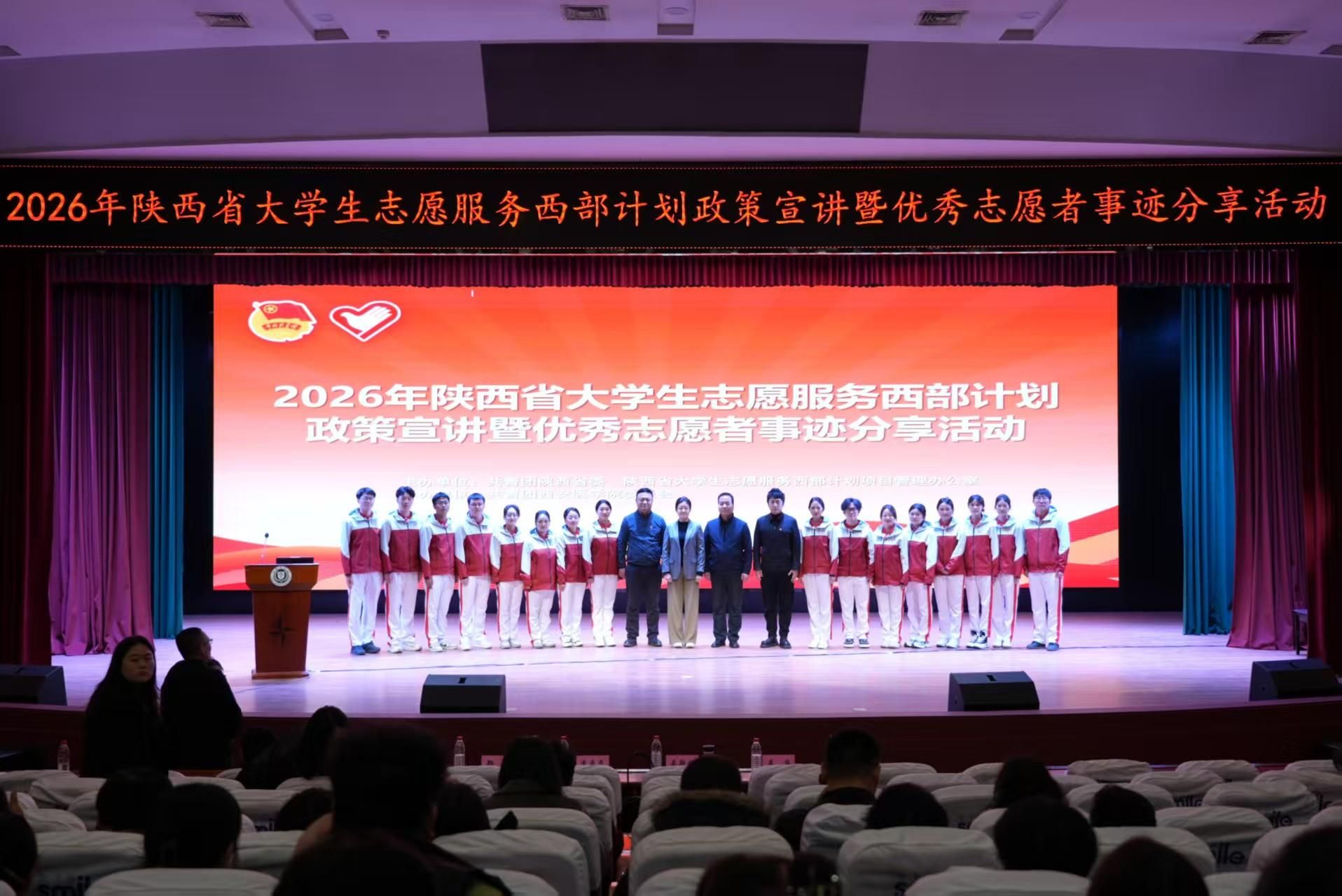 3月23日,由团省委主办、我校承办的“2026年陕西省大学生志愿服务西部计划政策宣讲暨优秀志愿者事迹分享活动”在未央校区举办。团省委副书记吴斯怡、副校长李庆民出席活动。我校及长安大学、陕西科技大学等高校的300余名应届毕业生参加活动。会议由校团委书记周豪主持。