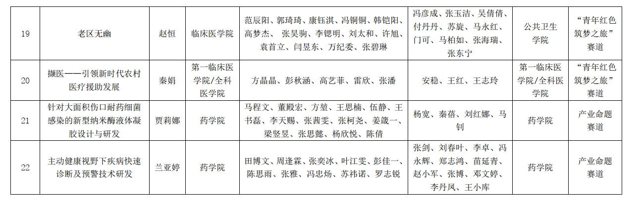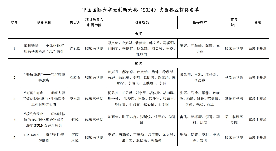 近日,中国国际大学生创新大赛陕西赛区省级复赛获奖名单揭晓。我校学生在大赛中表现出色,各赛道共获奖22项,其中金奖1项,银奖9项,铜奖12项,获奖数量与质量再创历史新高。临床医学院廉婷作为指导教师,教务处梁静作为组织工作者受到大赛表彰。