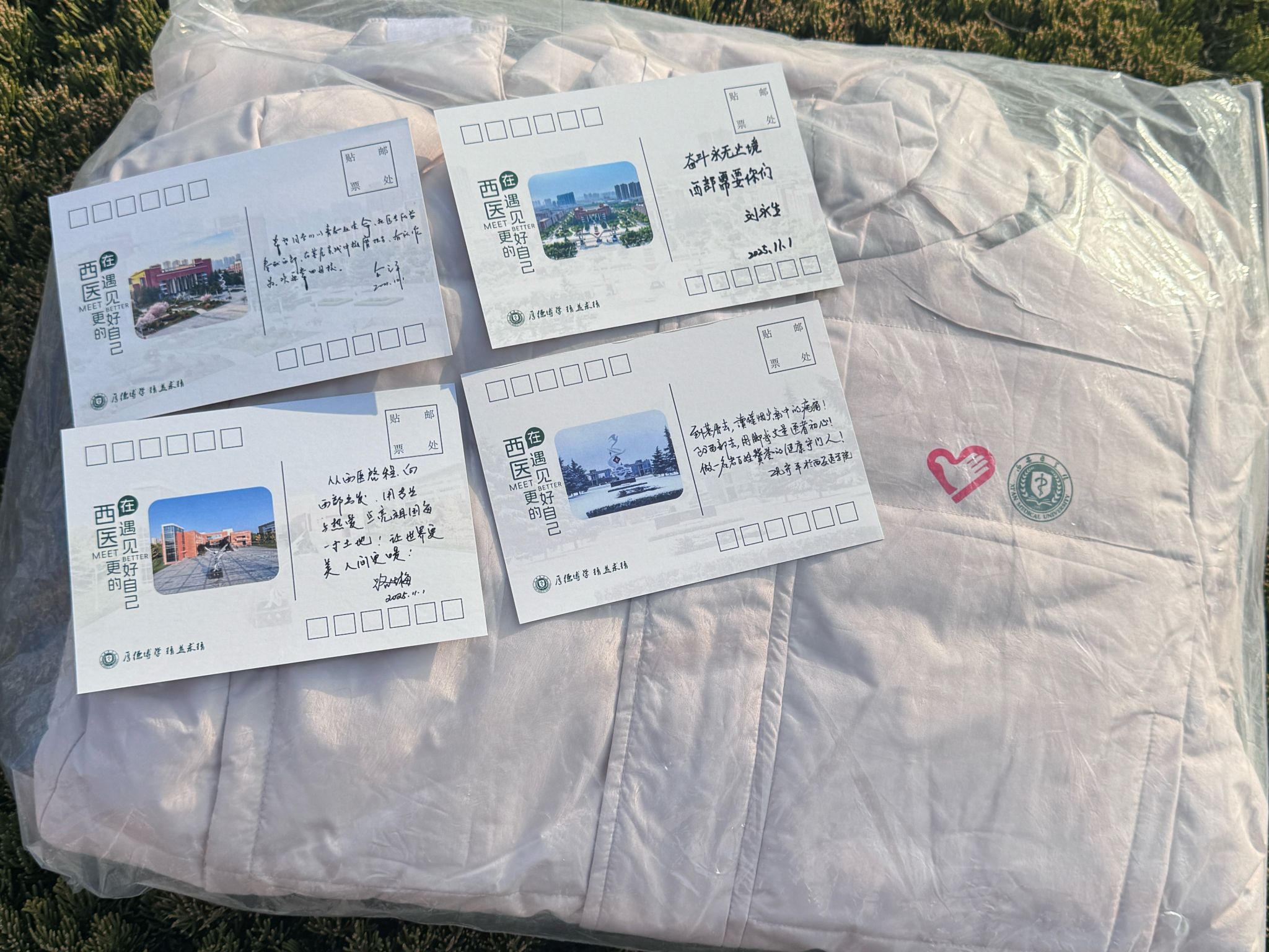 包裹里,是一件厚实的长羽绒服,用以抵御即将到来的凛冽寒冬。比衣物更温暖的,是随箱寄达的四张明信片。提笔人,有以一生守护一方健康的“最美医生”路生梅,有扎根乡土数十载的“中国好人”刘永生,还有校党委书记余立平、校长巩守平。纸短情长,每一句叮嘱与鼓励,都承载着穿越距离的牵挂与关怀。