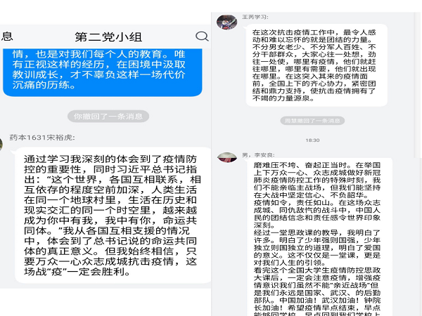 自疫情发生以来,药学院党总支学生一支部的党员们在做好自身防护,居家学习的同时,也积极带动身边同学,居家学习保证“学习不带队”,相聚云端保证“党建工作不掉线”,坚决保证特殊时期组织生活正常开展,充分发挥学生党支部的战斗堡垒作用和党员先锋模范作用。(药学院 文/袁欣 图/王菘人 王航 张宝龙)