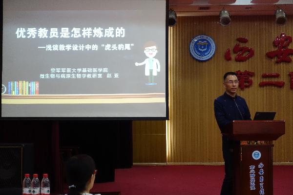 第一场讲座邀请空军军医大学赵亚(教授)做报告,题目是《优秀教员是怎样炼成的——浅谈教学设计中的“虎头豹尾”》,赵亚教授深入浅出围绕教学设计、教学理念及方法、精神引领、课程思政等多方面进行了全方位多角度的阐释如何做好一位优秀的临床教师。