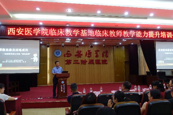 我校2019年临床教学基地教师教学能力提升培训会(第二场)于7月16日下午两点半在西安医学院第二附属医院科研楼多功能厅举办。此次培训是我校2019年系统性对临床教学基地临床教师教学能力提升举办的第二场活动,由学校教师发展与教学评价中心主办、实践教学处协办、西安医学院第二附属医院具体承办了本次会议。参会单位包含第一附属医院、第二附属医院、汉中市中心医院、西安市红会医院、西安市第九医院等多所临床教学基地200余名临床教师参加此次培训。