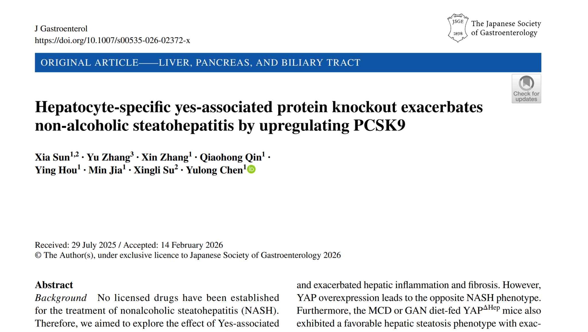 2026年2月28日在日本胃肠病学协会官方期刊Journal of Gastroenterology(中科院1区,IF=5.5,五年IF=6.2,Top)在线发表题为“Hepatocyte‑specifc yes‑associated protein knockout exacerbates non‑alcoholic steatohepatitis by upregulating PCSK9”[肝细胞YAP敲除通上调PCSK9加重代谢功能障碍相关脂肪性肝炎]的研究论文,揭示了肝细胞YAP经OSM-JAK2-STAT3轴调控PCSK9改善代谢功能障碍相关脂肪性肝炎的新机制,为代谢功能障碍相关脂肪性肝炎的药物研发提供了新的靶点。西安医学院为唯一第一作者和通讯作者单位,陈玉龙教授和苏兴利教授为通讯作者,孙霞为第一作者。