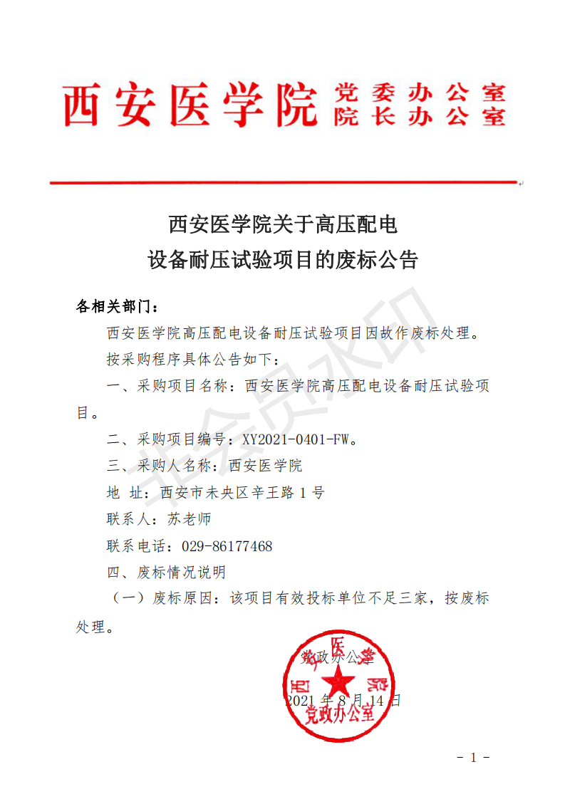 西安医学院关于高压配电设备耐压试验项目的废标公告(校内)