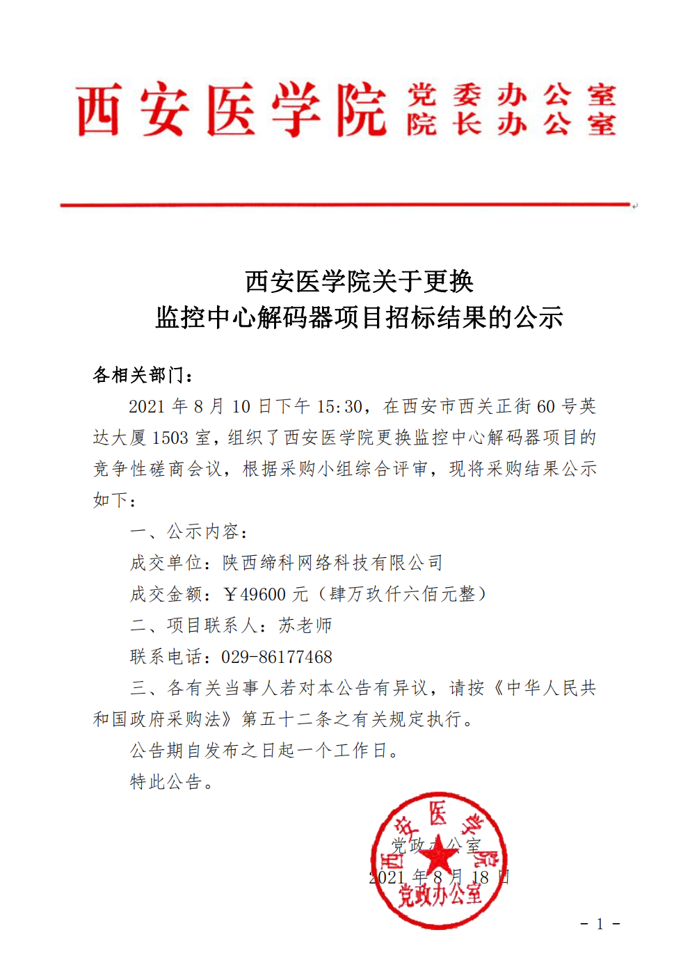 西安医学院关于更换监控中心解码器项目招标结果的公示(校内)