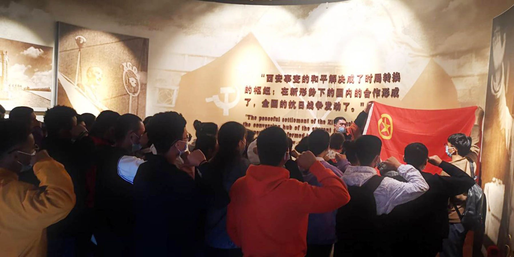 全体师生跟随着讲解员的步伐,认真聆听着西安事变的历史经过,同学们被一张张黑白照片、一件件实物信件所吸引,大家驻足凝望,深情回顾张学良、杨虎城将军为国为民艰苦奋斗的爱国义举,深切缅怀两位伟大的爱国将领,为了中华民族的振兴置个人安危于不顾、以国家利益为重,浴血奋斗、共御外敌的伟大精神。面对着鲜红的中国共产主义青年团团旗,全体同学庄重的举起右拳,重温入团誓词,铿锵有力的声音在空中回旋、告慰着为新中国解放事业牺牲的英烈们!