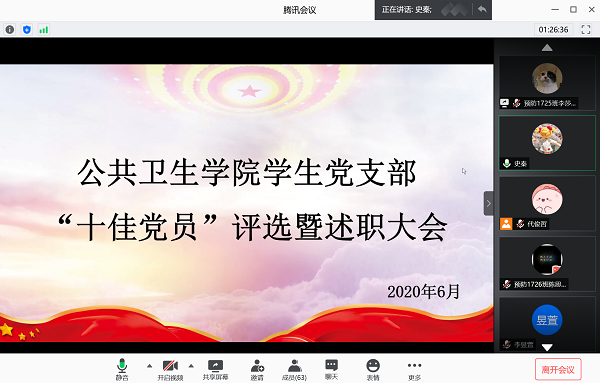为激发广大学生爱国情怀,提升学生防疫意识,表彰疫情中表现突出的学生党员,充分发挥广大学生党员的先锋模范作用,增强共产党员的荣誉感和责任感,提升广大党员抗疫信心,6月27日晚7点,公共卫生学院学生党支部通过“腾讯会议”线上平台开展了“十佳党员”评选暨述职大会。公共卫生学院部分学生党员参加了会议,学生第一党支部书记史秦、学生第三党支部书记林鑫鑫参加会议并担任评委。