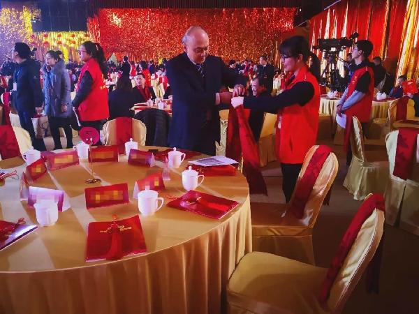 2月1日下午,志愿者统一上岗,身着印有“西安青年志愿者”字样的红马甲,在负责人的带领下进行会场布置,为本次团拜会24桌领导及嘉宾摆放桌牌、会务手册、石榴花等与会物品,并配合工作人员完成其他工作。2月2日上午,各位与会领导、嘉宾相继到来,志愿者们遵循“职责明确,一人一桌”的服务原则,引导与会领导和嘉宾落座并配合完成其他事宜。