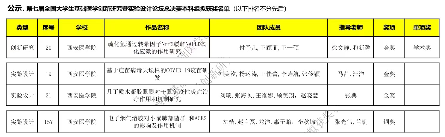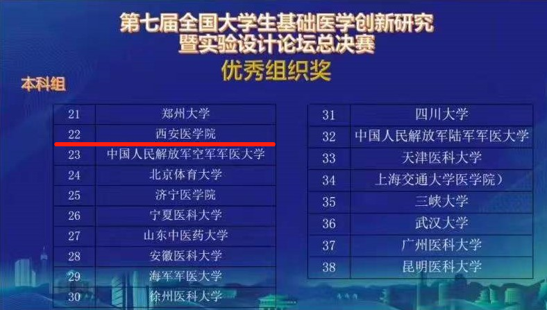 2021年12月3—6日,由高等学校国家级实验教学示范中心联席会基础医学组主办、空军军医大学承办的第七届全国大学生基础医学创新研究暨实验设计论坛全国总决赛在西安举行。经由各高校遴选、地区赛选拔,最终进入国赛的共有来自全国114所本科院校的265支参赛队伍,参赛学生共计1137名,指导教师共计383名。在此次强手如林、竞争激烈的大赛中,我校共有4支参赛队伍进入国赛。