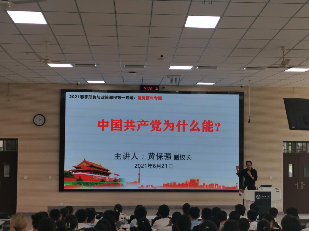 副校长黄保强在教学楼智慧大讲堂为2020级四个班级学生上了一堂关于《中国共产党为什么能》的思政大课。他通过讲述中国共产党领导中国人民历经100年峥嵘历程完成了开天辟地的救国大业、改天换地的兴国大业、翻天覆地的富国大业、惊天动地的强国大业,指出今日盛世实现了中华民族发展历程中无数胸怀家国情怀的仁人志士与革命先烈的美好愿景,阐释了中国共产党“为中国人民谋幸福、为中华民族谋复兴”的初心使命,由此提出了“中国共产党为什么能”的命题。他通过案例分析、数据引证、图片解读等多种方式深入阐释了中国共产党坚定马克思主义信仰,坚持以人民为中心的发展思想,中国共产党人坚定崇高的理想信念,充分论证了中国共产党为什么能,引导同学们紧密团结在以习近平同志为核心的党中央周围,听党话,跟党走,坚定“四个自信”,做到“两个维护”。他引经据典、旁征博引,思接古今,道贯中西,丰富了思政课堂内容,加深了思政课堂深度,扩大了思政课堂广度,提升了思政课堂力度,增强了思政课堂效度。