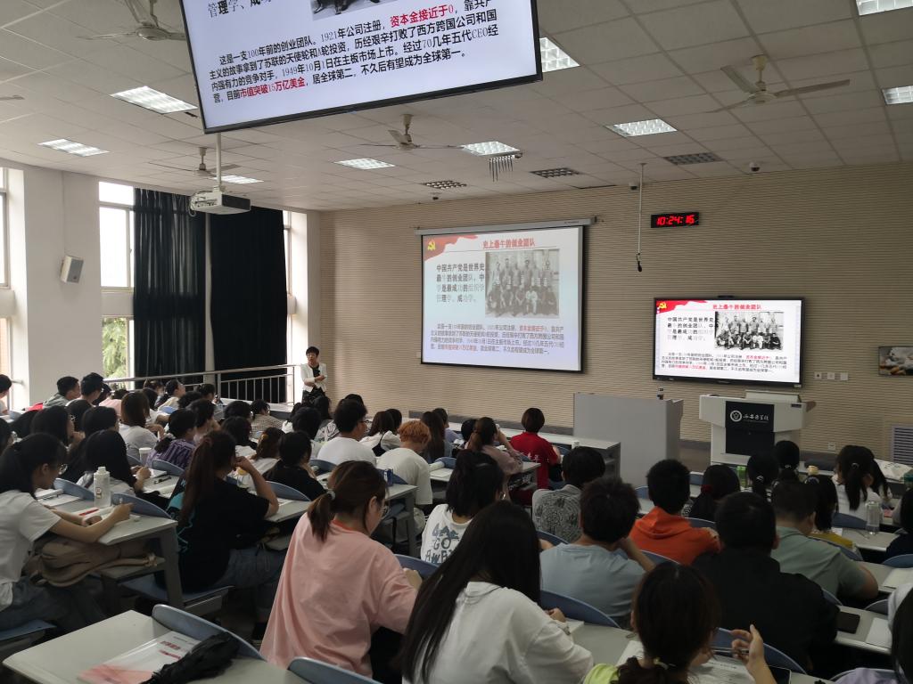 党委副书记、校长杨帆从中国共产党百年革命、建设、改革发展的历史逻辑、理论逻辑、实践逻辑三个层次展开专题教学。他从阐明党史学习教育的重大意义入手,带领同学们回顾了中国共产党从苦难走向辉煌的百年救国史、兴国史、富国史、强国史,引导同学们深刻理解中国共产党100年来不断走出苦难,走向辉煌的根本原因在于拥有科学的理论指导,在于拥有坚定的理想信念,在于拥有强大的组织优势,在于拥有坚实的群众基础,在于拥有彻底的自我革命,从而深刻启发同学们真正认识到学习党史就要做到:站定立场,树立正确的历史观,坚决反对历史虚无主义;要听党话,跟党走,坚定理想信念,增强政党自信,增强四个自信;努力学习知识技能,练就真本领,积极弘扬中国精神,传承红色基因。这堂课资料丰富、内容充实,语言风趣幽默、引人入胜,同学们听讲积极认真,课堂氛围热烈。