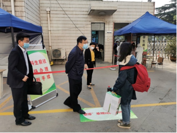 4月27日,根据毕业年级学生错峰返校实施方案,我校含光校区迎来了第一批返校学生。为确保学生报到工作安全、有序进行,校党委书记范兵、院长杨帆、党委副书记熊冬梅、副院长张越林、副院长姚文柱等校领导现场检查工作,欢迎同学们返校。学校相关职能部门及学院负责人、辅导员、校医院医务人员、安保后勤工作人员全部到位,为返校学生提供安全贴心的服务。碑林区卫健局、教育局及卫生监督局的工作人员对我校学生返校后各项防控措施落实情况进行了检查,重点了解了学校疫情防控工作、物资储备、食品安全、生活饮用水卫生、校园安全等情况,同时就相关工作进行了现场指导。