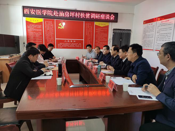 随后,校地双方在油房坪村党建活动室召开了“驻村联户”扶贫调研座谈会。座谈会上,村支部书记柯曾武介绍了油坊坪村脱贫出列情况、疫情防控工作开展情况和2020年村脱贫防返贫工作计划,他代表全体村民对我校去年为村脱贫出列作出的种种贡献、今年疫情期间捐赠防疫物资助力村疫情防控表示衷心感激。丹凤县副县长张争京代表县委县政府对我校在脱贫攻坚及抗疫期间给予丹凤县的帮助表示衷心的感谢,并介绍了丹凤县今年的扶贫计划及对学校的需求,期间就一些具体事项与杨帆院长、姚文柱副院长、校第二附属医院王建榜书记进行了深入交流。