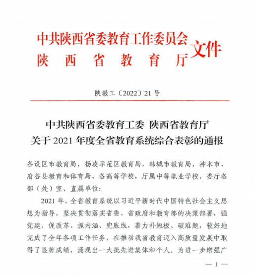 近日,中共陕西省委教育工委、陕西省教育厅下发陕教工[2022]21号《关于2021年度全省教育系统综合表彰的通报》文件,我校荣获“2021年全省教育网络安全和信息化工作先进集体”称号,信息技术处校园卡管理中心主任袁华兵获得“先进个人”荣誉称号。