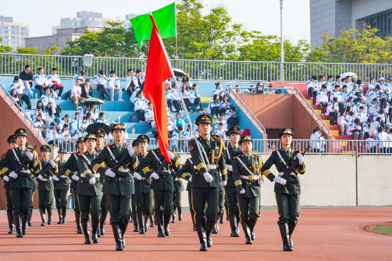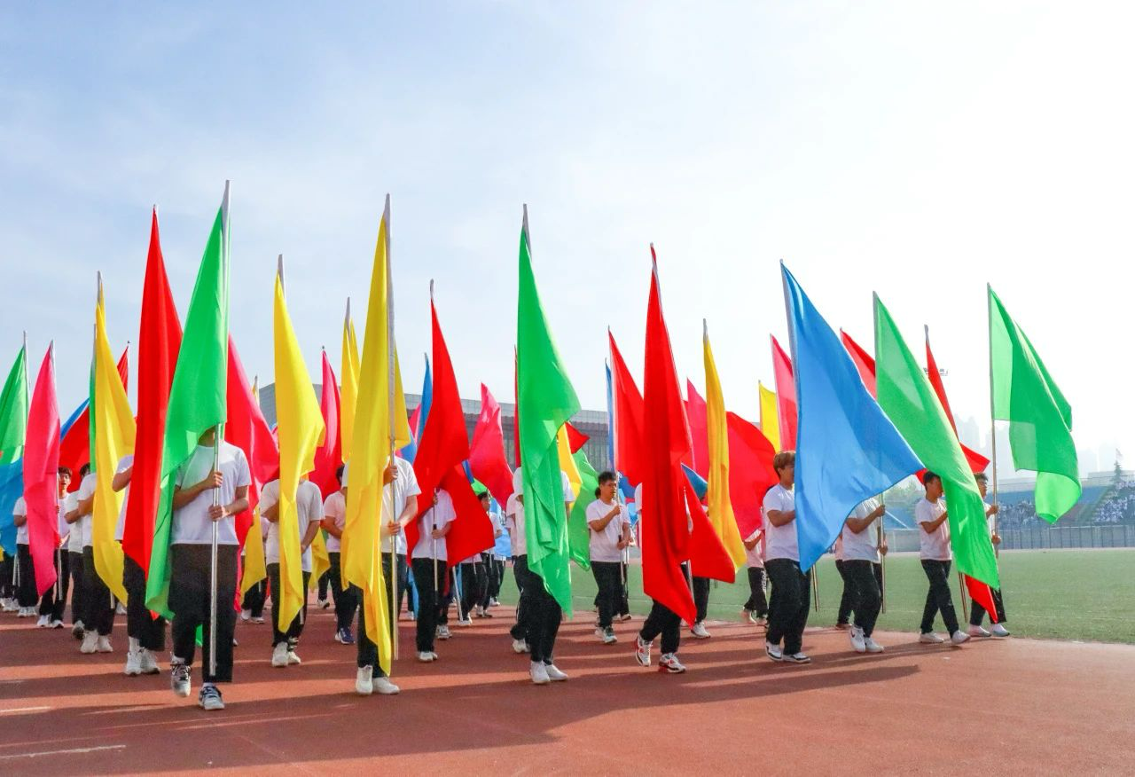 上午8时,在全场的瞩目中,国旗、校旗、会徽护卫队迈着铿锵有力的步伐率先走进运动场。花束队、彩旗队、裁判员、学生代表队、教职工代表队紧随其后,队列整齐、英姿勃发。