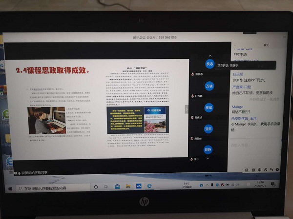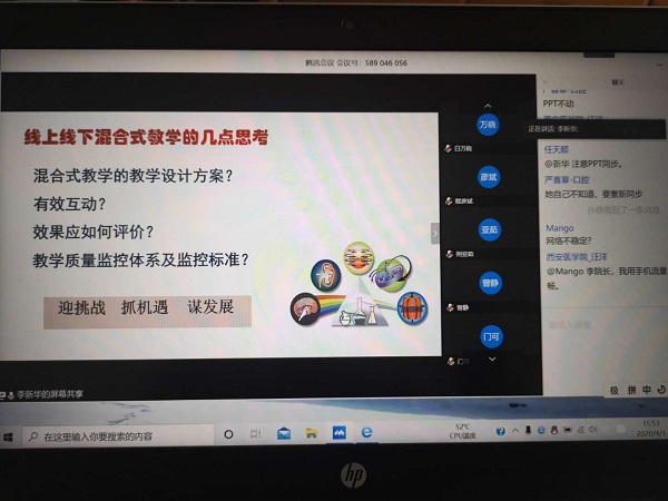 随后,基础医学部、医学技术学院、第一临床医学院负责人分别通过PPT,从在线教学前期准备、运行管理、质量保障及开学后线上线下教学衔接等方面进行汇报交流,内容丰富,图文并茂,各有特色。基础医学部开展的跨院部教学观摩和交流,医学技术学院持续进行的“每周一课”公开课活动,第一临床医学院邀请援鄂医疗队队员刁鑫副教授利用休息时间为学生进行特殊的互动与授课、线上直播线下手术视频等,给参会者留下深刻印象,大家受益匪浅。