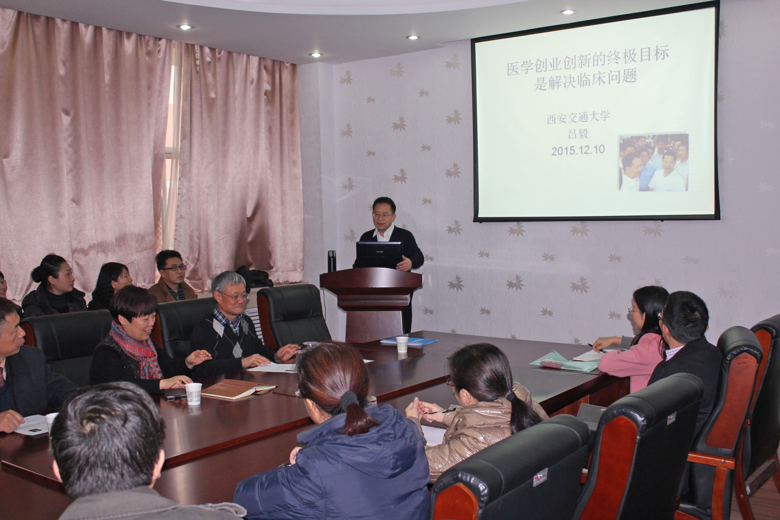 2015年12月10日中午,西安交通大学校长助理吕毅教授应邀到我校基础与转化医学研究所参观、座谈,宾主以“学科交叉、科技创新”为主题,进行了深入的探讨。吕毅教授首先对我校基础与转化医学研究所成立3年来所取得的成果给予了高度评价,并介绍了他打造“外科梦工场”,实现科技创新的“梦之路”,在10年取得了一系列的科研成果:包括2项陕西省科学技术一等奖,1项教育部技术发明一等奖的亲身经验和体会,给我们传经送宝,为我校基础与转化医学研究所暨陕西省缺血性心血管疾病重点实验室的建设,提出了宝贵的建议。座谈会后,弥曼副院长代表我校给吕毅教授赠送了我校的纪念品,并合影留念。