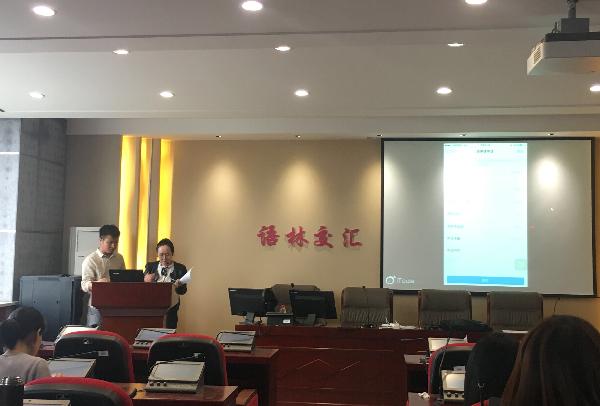 2018年4月11日下午,教务处在英语系报告厅组织了基于“钉钉”的在线调停课审批培训会。英语系主任陈蓁、副主任薛英利、教务处教学管理科科长孙菊、英语系全体教师及相关部门工作人员参加了会议。培训会上,孙菊首先介绍了本次培训目的。信息化建设是教务处近年来重点工作之一,教务处一直在探索如何利用信息化手段提升工作效率,为广大教师做好服务。经过广泛调研,决定使用“钉钉”系统,并选择和广大教师最为密切相关的调停课审批工作作为突破口。为此,教务处前期根据我校的实际情况对“钉钉”软件的调停课页面进行了合理系统的设置,确定了“钉钉”在线调停课审批的详细流程和培训方案。本学期将此项工作作为信息化建设的重点工作之一,以英语系作为试点院系,举行培训会,正式启动此项工作。