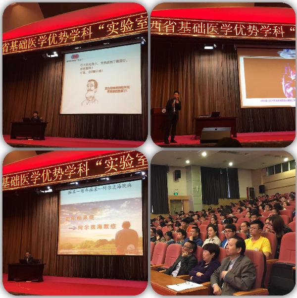 5月27日下午,科普知识讲座和大学生基础医学创新论坛在西安医学院学术报告厅进行。参加本次讲座的有西安医学院副院长李雪萍教授;基础医学研究所所长罗秀成教授;基础医学部主任、科技处处长苏兴利教授;基础医学部副主任、基础与转化医学研究所副所长、中国细胞生物学学会第十届理事、陕西省细胞学会常务理事苟兴春教授。报告由罗秀成教授主持,李雪萍院长用诙谐幽默语言对糖尿病的发病机制和预防知识进行讲解,有趣生动的语言和图片激发了在场师生的浓厚兴趣。苏兴利主任则用沉稳大气的台风、急缓顿挫的语调吸引了每一位听众,他结合了冠心病的最新现况与常见误区,为同学们介绍了冠心病的基本知识与预防措施,引起了大家对冠心病的关注与思考。苟兴春教授从最新科研成果出发,让大家掌握了常见的‘老年痴呆’的定义与机制并了解了最前沿的科研知识。正如每一位老师介绍的那样,本次讲座的真正目的并不局限于这三种常见病的科普,而在于唤起大家对健康的重视,更重要的是激发了同学们的科研思维和引起了同学们的科研兴趣,同时也响应了我国“万众创新、大众创业”的号召。