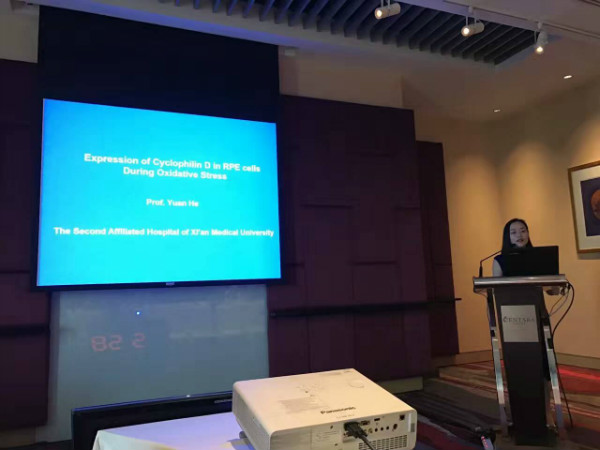 何媛教授在此次大会中发言,题目为:“Expression of Cyclophilin D in RPE cells During Oxidative Stress”《Cyclophilin D在氧化应激损伤下视网膜色素上皮细胞中的表达》