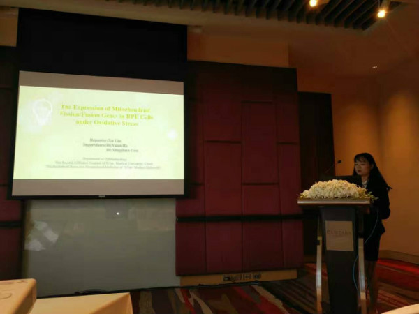 何媛教授指导的在读硕士研究生刘旭发言,题目为“The Expression of Mitochondrial Fission/Fusion Genes in RPE Cells under Oxidative Stress”《线粒体分裂、融合基因在氧化损伤的人视网膜色素上皮细胞中的表达》
