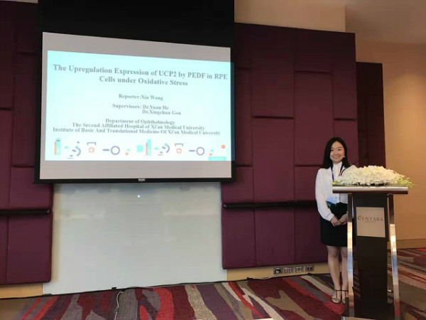 何媛教授指导的在读硕士研究生王霞发言,题目为:“The Upregulation Expression of UCP2 by PEDF in RPE Cells under Oxidative Stress”《PEDF对氧化应激损伤下视网膜色素上皮细胞UCP2表达的影响》