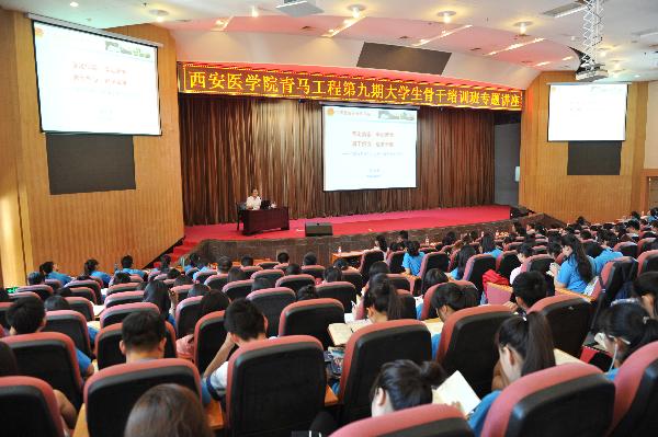 (团委)6月12日下午,西安医学院第九期“青马工程”大学生骨干培训班专题讲座在学术报告厅成功举办。校团委全体成员,各院系团总支书记,学校、各院系各级学生组织学生骨干等共计近五百人聆听了讲座。本次讲座特邀共青团陕西省委副书记、陕西省青年联合会副主席徐永胜,为大家做了题为《坚定信念 牢记使命 勇于担当 追求卓越》的专题讲座。讲座由校团委书记、学工部副部长王燕主持。