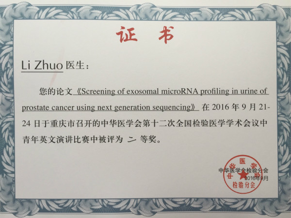 我校第一附属医院检验科李卓主任在大会特设的“英文论文演讲”比赛中脱颖而出,通过与来自全国的12位优秀参赛选手进行角逐,所演讲论文《Screening of exosomal microRNA profiling in urine of prostate cancer using next generation sequencing》最终以第2名的优异成绩,一举荣获青年英文演讲比赛二等奖。
