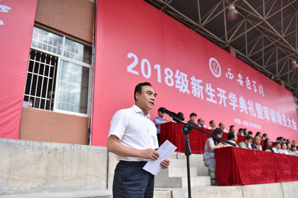 9月10日上午,我校2018级新生开学典礼暨军训动员大会在未央校区体育场隆重举行。校党政领导范兵、杨帆、黄保强、熊冬梅、李雪萍、张越林、吴毅、姚文柱及武警陕西总队西安武警支队副参谋长、西安医学院军训团团长李波中校和学校所有党政部门、各附属医院负责人、各院(部)负责人,全体西安医学院军训团教官,教师、辅导员代表,2018级全体本科新生参加大会。大会由党委副书记熊冬梅主持。