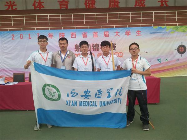 2017年6月10日至11日,由陕西省教育厅主办,陕西省学生体育协会、西北大学承办的2017年陕西省大学生射艺锦标赛在西北大学长安校区举行。本届赛事有西北大学、西安交通大学、陕西师范大学、西北政法大学、西安医学院等多所高校参与比赛。西安医学院射艺队由齐佳老师任领队,陈亮老师任主教练,王也夫老师任工作人员,参赛队员:何嘉乐、李俊凯、李磊、谢斐,参加男子个人排名赛、男子团体排名赛、男子团体淘汰赛等项目比赛,经过激烈角逐,获得男子团体淘汰赛第四名、男子团体排名赛(30米)第五名、男子个人30米第六名的好成绩。